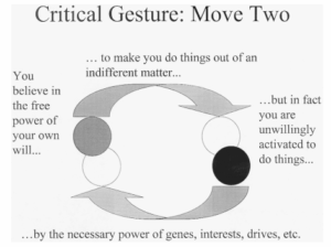 But, wait, a second salvo is in the offing, and this time it comes from the fact pole. This time it is the poor bloke, again taken aback, whose behavior is now “explained” by the powerful effects of indisputable matters of fact : “You, ordinary fetishists, believe you are free but, in reality, you are acted on by forces you are not conscious of. Look at them, look, you blind idiot” (and here you insert whichever pet facts the social scientists fancy to work with, taking them from economic infrastructure, fields of discourse, social domination, race, class, and gender, maybe throwing in some neurobiology, evolutionary psychology, whatever, provided they act as indisputable facts whose origin, fabrication, mode of development are left unexamined).