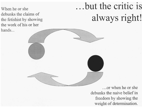 We can summarize, I estimate, 90 percent of the contemporary critical scene by the following series of diagrams that fixate the object at only two positions, what I have called the fact position and the fairy position—fact and fairy are etymologically related but I won’t develop this point here. The fairy position is very well known and is used over and over again by many social scientists who associate criticism with antifetishism. The role of the critic is then to show that what the naı¨ve believers are doing with objects is simply a projection of their wishes onto a material entity that does nothing at all by itself. Here they have diverted to their petty use the prophetic fulmination against idols “they have mouths and speak not, they have ears and hear not,” but they use this prophecy to decry the very objects of belief— gods, fashion, poetry, sport, desire, you name it—to which naı¨ve believers cling with so much intensity. And then the courageous critic, who alone remains aware and attentive, who never sleeps, turns those false objectsinto fetishes that are supposed to be nothing but mere empty white screens on which is projected the power of society, domination, whatever. The naïve believer has received a first salvo.