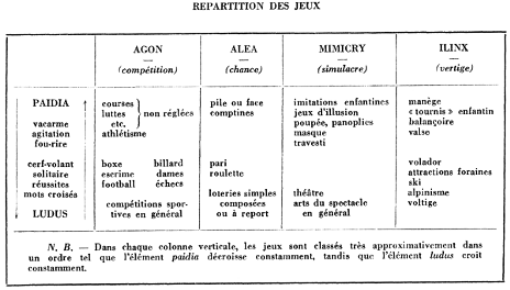 Fig 2. La répartition des jeux de Roger Caillois. Les coordonnées du jouage joussien représenté par le manège et le tournis enfantin sont : paidia,illinx.